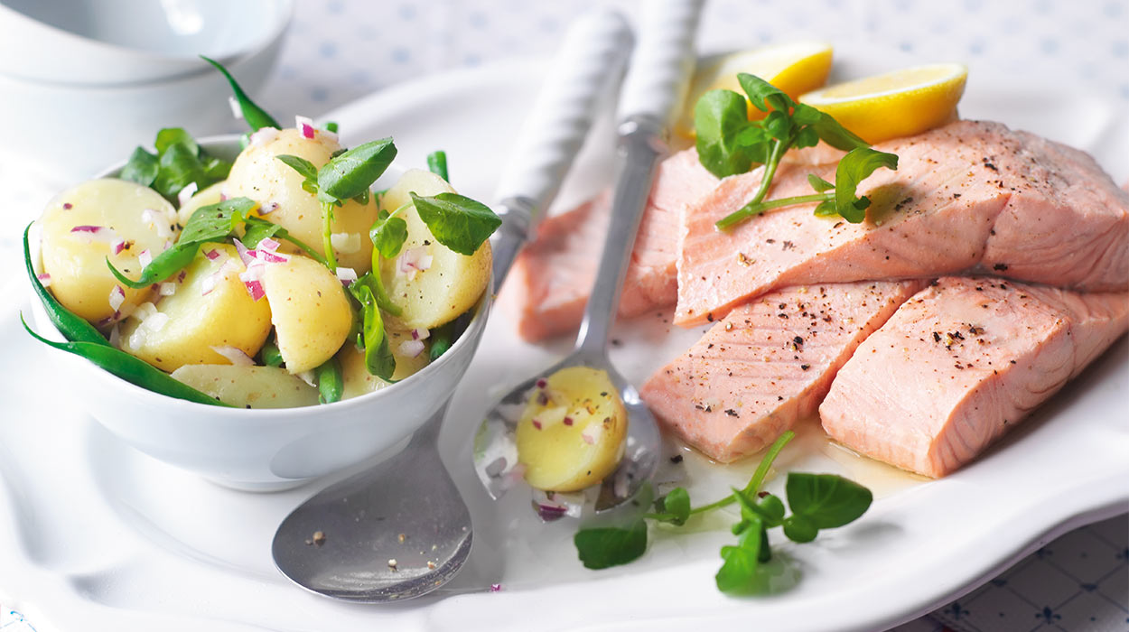 Wino oraz 150 ml wody wlewamy do szerokiego garnka, dodajemy resztę cebuli. Doprawiamy solą, pieprzem i zagotowujemy. Łososia myjemy, osuszamy i wkładamy do garnka. Zmniejszamy ogień i trzymamy łososia pod przykryciem przez ok. 4 minuty, nie gotujemy. W międzyczasie roszponkę myjemy i odsączamy. Sałatkę doprawiamy do smaku, dodajemy roszponkę i mieszamy, podajemy z odsączonym łososiem.