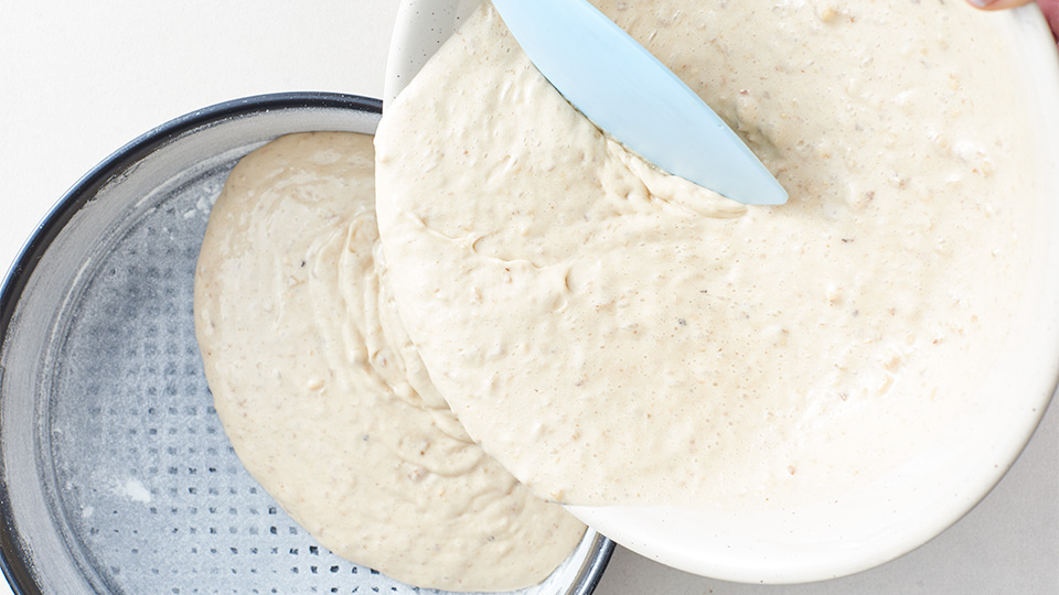 Białka ubijamy – gdy są już dobrze napowietrzone, stopniowo dosypujemy cukier i ubijamy na sztywną pianę. Zmniejszamy obroty i stopniowo dodajemy żółtka oraz przestudzone roztopione masło. W osobnej misce mieszamy mąkę, zmielone orzechy oraz proszek do pieczenia. Chałwę kruszymy drobno. Ubite jaja mieszamy z suchymi składnikami za pomocą rózgi. Na końcu dosypujemy chałwę, mieszamy. Masę przelewamy do foremki wysmarowanej masłem i oprószonej mąką. Wstawiamy do piekarnika nagrzanego do 170°C i pieczemy przez 15–17 minut.